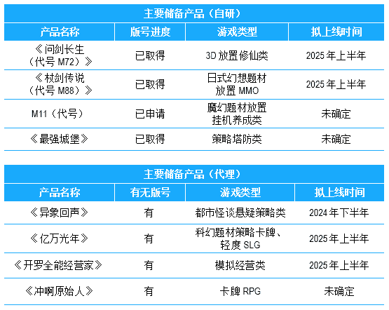 公司储备多款新品,,,,期待为玩家解锁更多新鲜体验,,,部分产品如下表所示::::