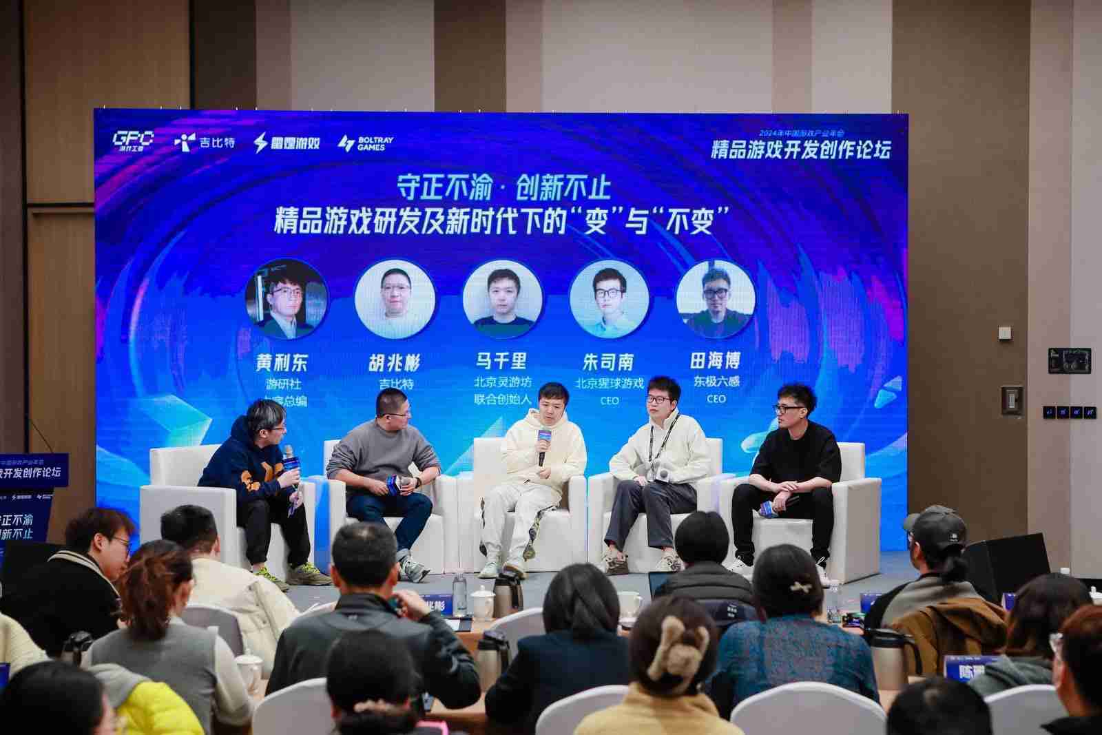 圆桌对话环节,,,在游研社内容总编黄利东的主持下,,,35273CTO胡兆彬、、、北京灵游坊联合创始人马千里、、、北京猩球游戏CEO朱司南、、、、东极六感CEO田海博等四位嘉宾围绕“守正不渝、、、、创新不止——精品游戏研发及新时代下的‘变’与‘不变’”这一主题分享了各自在精品游戏开发理念及工程能力搭建方面的见解和经历,,,,并就行业变化下游戏人需要坚守的理念等展开交流探讨。。。。