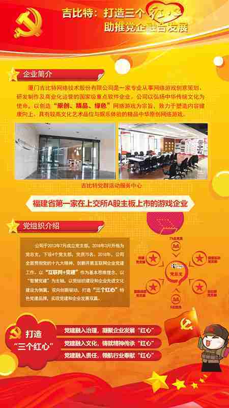 未来公司将全面学习贯彻习近平新时代中国特色社会主义思想和党的十九大精神,,,持续强化“互联网+党建”的思维理念,,以“智慧党建”为主轴,,,,以党组织建设和企业先进文化建设为侧翼,,,,双向创新驱动,,引领有信仰、、、有情怀、、、、有价值的新时代游戏研发运营,,在不断发展壮大的同时,,成为行业的“红色标杆”,,,,实现党建和企业发展双赢。。