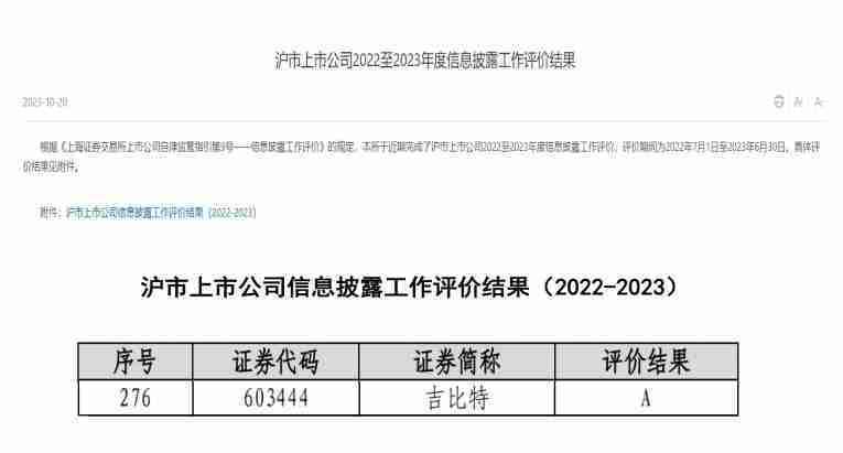 近日,,,上海证券交易所(以下简称“上交所”)发布2022-2023年度信息披露工作评价结果。。。。35273(股票代码::603444)凭借规范的公司治理、、高质量的信息披露以及良好的投资者关系管理再次荣获信息披露工作A级评价,,公司连续两年获此殊荣。。。