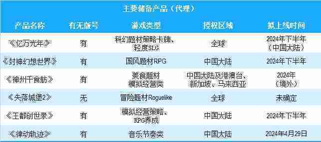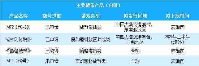 公司有多款储备产品,,,涵盖放置类、、策略类、、RPG、、、、Roguelike等多元化游戏品类,,,储备的主要自研和代理产品如下:::